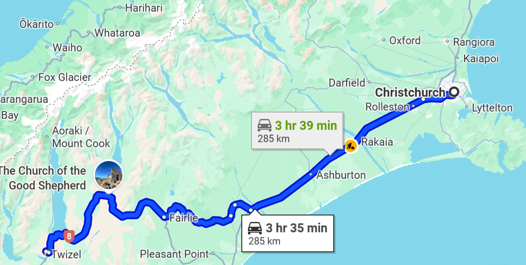 The road to Twizel is part of the adventure — just over 3 1/2 hours from Christchurch International Airport, with mountains, turquoise lakes, and breathtaking landscapes all the way.